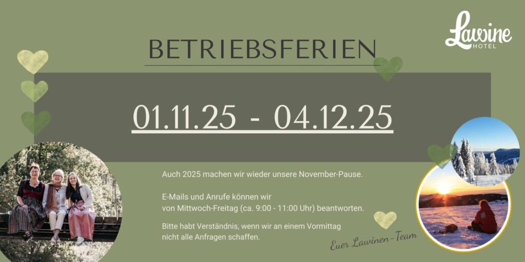 Das Hotel steht Ihnen jedoch weiterhin zur Verfügung und blickt voller Vorfreude auf eine schöne Herbst- und Winterzeit.