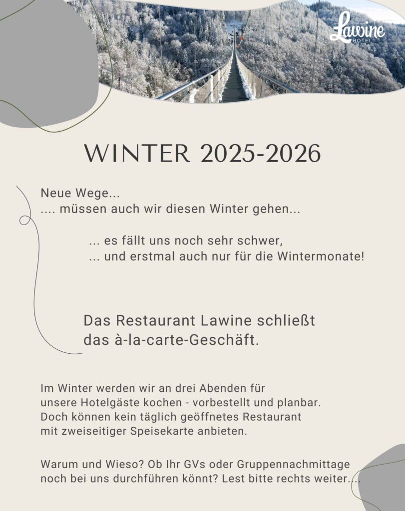 Wir können und wollen in unserem Restaurant Lawine aber keinen Schnell-Ersatz einstellen müssen! Nehmen uns die Zeit für Entwicklung. Wir bitten Euch daher alle um Euer Verständnis und Euer Vertrauen.